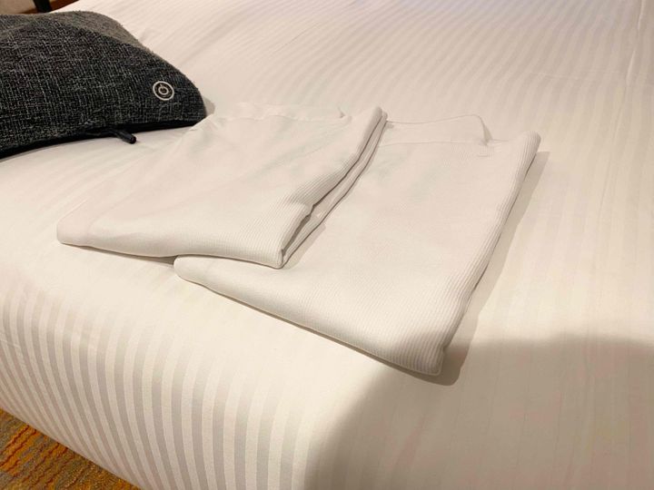 ベッドの上には電動のマッサージ機と、ワンピースタイプのルームウェア。