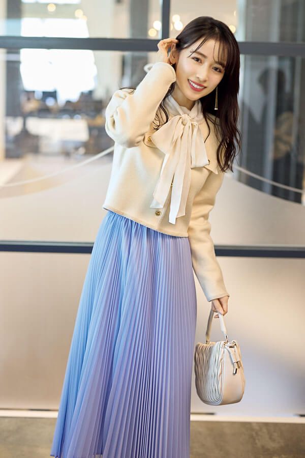 ソフトなニットジャケットできちんと見せと親近感を両立! 社内の人が相手なら、堅すぎない程度のきちんと感がとっつきやすく好印象。パステルブルーやボウタイの甘さで優しげに。同じ会社で働く仲なので、必要以上にかしこまらなくてOK。きれいめなレディコーデで感じのよさを狙って。