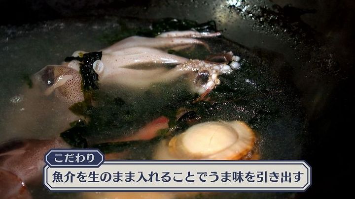 そして、魚介を生のままスープに入れることでうまみを引き出します。