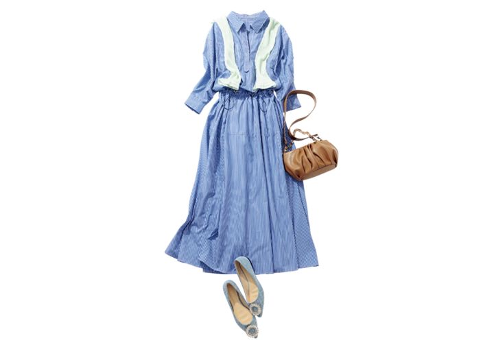 月曜の朝から忙しい日や遅刻しそうな日は、ワンピに頼るのが正解。スーツ姿の男性社員が多い職場も、襟付きだから浮かずにきちんとした印象に。ぷっくり型が愛らしいミニバッグは、ギャザー入りのブラウンレザーが大人らしさと可愛さを両立してくれます。