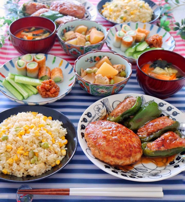 おかずのピーマンの肉詰めとミニハンバーグはひとつのネタから2品作っています。