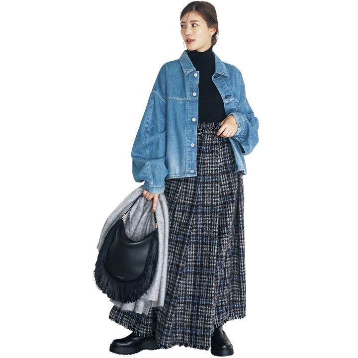 今年らしいオーバーサイズにゆったり袖のデザインなら、厚手のニットの上にだって羽織れます。まだ寒いけれどコートは着たくない3月4月にあると心強く、甘いスカートをほどよくラフに仕上げてくれます。デニムジャケットはKURO iro、ニットはCOZ manufactured by WRAPINKNOT、スカートはカオス、バッグはJ&M デヴィッドソン、ブーツはアルアバイルのもの。