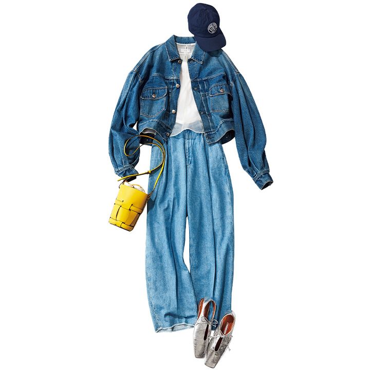 デニムonデニムをするなら色みを揃えたほうがいい気もしますが、そうしなくても元気なカジュアルコーデにまとまります。よりキレイめにしたいなら、揃えるのがおすすめ。デニムジャケットはハイク、ブラウスはロエフ、デニムパンツはサードマガジン、バッグはオルセット、靴はピッピシック、キャップはSEAのもの。