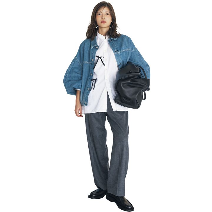 アウトしたシャツの上に羽織って、レイヤードを楽しんで。Gジャンがあることで、防寒とトレンド感が手に入ります。ボリューム袖のデザインがより今っぽさを後押し。デニムジャケットはKURO iro、ンシャツはボナム、パンツはウィム ガゼット、トートバッグはジャンニ キアリーニ、ローファーはJ.M. WESTONのもの。