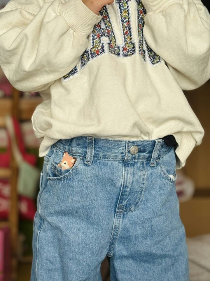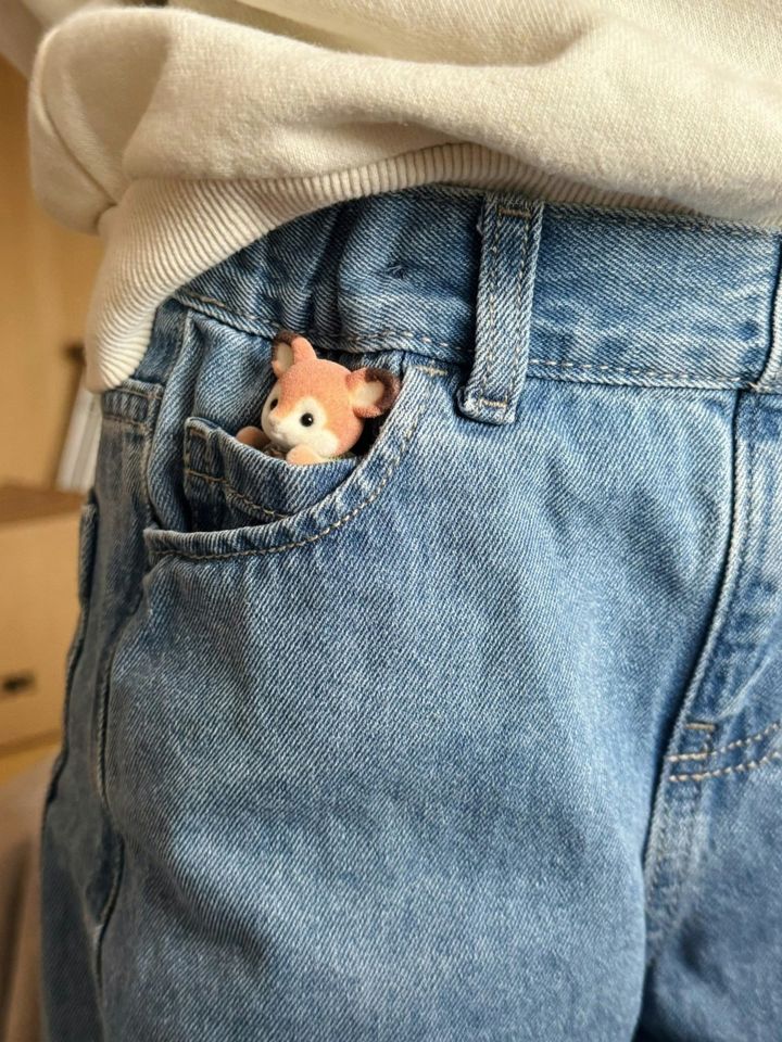 ジーパンの小さなコインポケットからひょっこり顔を覗かせているのは、なんとシルバニアファミリーのお人形!手もちょんと出されていて、ジャストフィットな漢字がかわいらしいですね。
