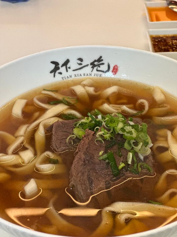 普通の牛肉麺は290元。私がいただいたのは「極品牛B腱麺」480元。見た目や量は変わらず、牛肉の種類が違うみたい。店名にもある“三絶”とは、トマト、玉ねぎ、オーストラリア産牛スネ肉の3つを煮込んだスープが由来。醤油ベースで、すっきりあっさり、優しいコクがありました。辛いのが好きな人は、お好みで辣醤を入れて調節を。麺は3種類からセレクトでき、きしめんみたいな太麺、自家製の中太麺、卵入りの細い鶏蛋麺が。今回は、お店のイチオシである“自家製麺”にしました。つるつる、もちもちでのど越しも最高。牛肉は臭みがなく、ホロホロでボリュームがあるのにあっという間に完食。食後に小さな盃に梅酢ドリンクが出るのも、高級店っぽいサービスだなと。