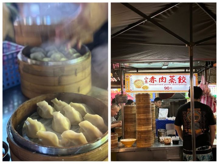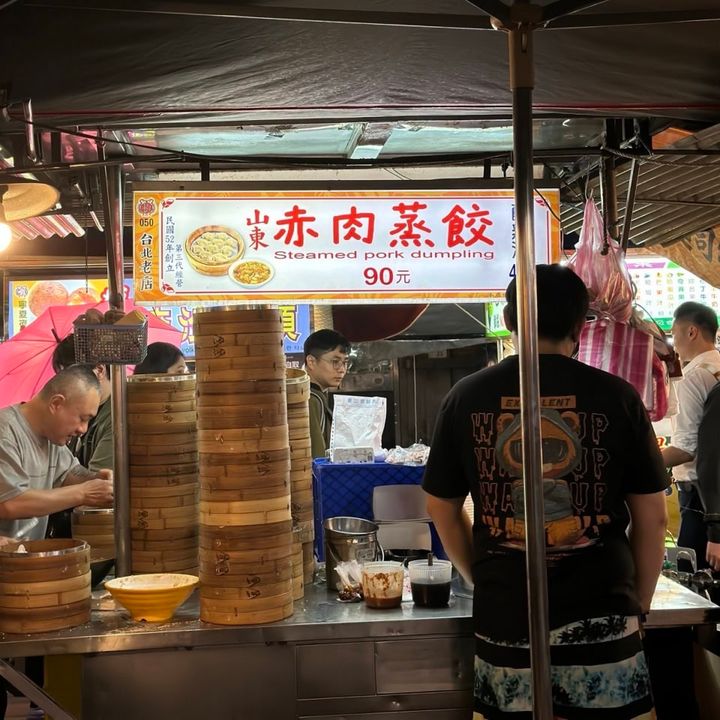 真ん中あたりにある賑わいは、有名な餃子店。創業60年以上という「山東赤肉蒸餃」です。せっせと包み、どんどん蒸していくのですが、あっという間にはけていきます。テーブルで台湾ビールといっしょにいただきます! ホカホカ、モチモチの餃子にほっこり。醤油、ニンニク、辣醤があるのでお好みで。酸辣湯もありますが、そちらは味が薄くてイマイチでした。ピークの18:30~20:00を避けるとスムーズに着席できますが、凄腕の店員さんがサクサクとさばき、回転も超早いので、ちょっと並べば食べられますよ。