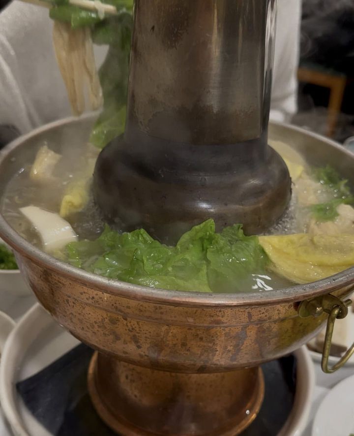 これが私達のお鍋。玉子餃子や青菜、エリンギ、シミ豆腐などを追加しています。もちろん、追加の酸菜やいろいろな肉類、団子類なども。真ん中の筒にアツアツの炭が入っています。ときどき煙突の上から炭粉が舞い落ちるので、白い服は避けた方がよいかも。
