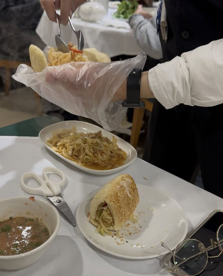 あっさりしたお鍋のスープが美味しく、最後の〆はどうしたものかと悩んでいたら、お隣のみなさんが美味しそうなものを食べている……。早速、同じものをオーダーします。酸菜肉絲(豚肉と酸っぱい白菜の炒め物)と小燒餅(パイ風のクレープ)。店員さんが開いて挟んで、食べやすいよう半分にカットしてくれます。酸菜肉絲は、結局は鍋の具材と同じものなのですが、また違った味わいでウマウマでした。ビールを2本とお茶を飲んで、3人で2,343元。