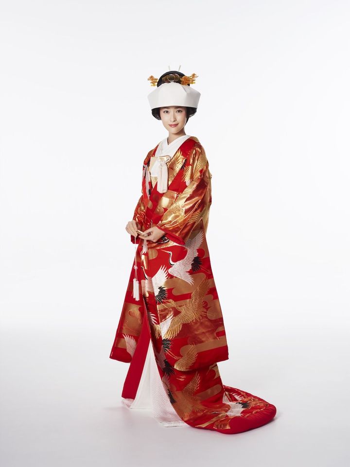 霞の中をたくさんの鶴が飛び交う姿を描いています。鶴は白地、金糸で描き分けることで、デザイン性が増してどこか幻想的な雰囲気に。打掛“赤霞群鶴文”¥700,000[レンタル価格](ハツコ エンドウ ウェディングス銀座 tel.03-3563-1411)