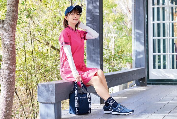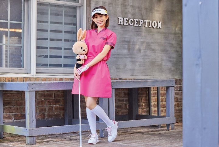 エレガンス派におすすめしたいのが、周囲までパッと華やぐピンクのワンピース。スタジャン風のデザインがスポーティなニュアンスを加えて、ゴルフシーンにぴったりです。女子力をアピールしたい日は、ウエスト両サイドのドローストリングを絞ってメリハリあるシルエットを作って。さらに攻めるなら、バニーのヘッドカバーでお茶目な個性を演出。きっと、抜群の可愛さが印象に残ります。