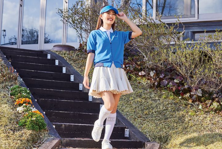 ブルゾン¥14,300(ピンアパレル/TSIお客様相談室) ポロシャツ¥14,300(ジャックバニー!!) スカート¥35,200、サンバイザー¥10,500 (共にチュクチュ/ソムアクラブ) ソックス¥2,000(ブリヂストンゴルフ アルティコア/ブリヂストンお客様コールセンター) シューズ¥14,300〈編集部調べ〉(アディダスゴルフ/アディダス ジャパン)