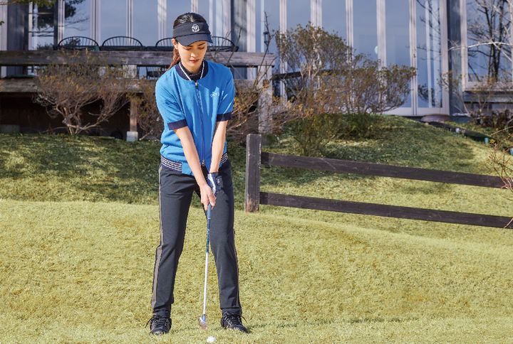 ブルゾン¥14,300、ハイネック¥11,000、シューズ¥15,400(以上ピンアパレル/TSIお客様相談室) パンツ¥24,200(マックレガーゴルフ/双日インフィニティ) サンバイザー¥10,500(チュクチュ/ソムアクラブ) グローブ〈両手〉¥4,400(ジャックバニー!!)