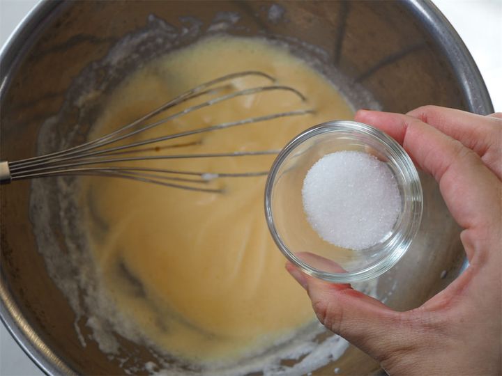 3. 2のボウルに1を入れ混ぜ合わせ、さらに砂糖を加えて軽く立てていく。