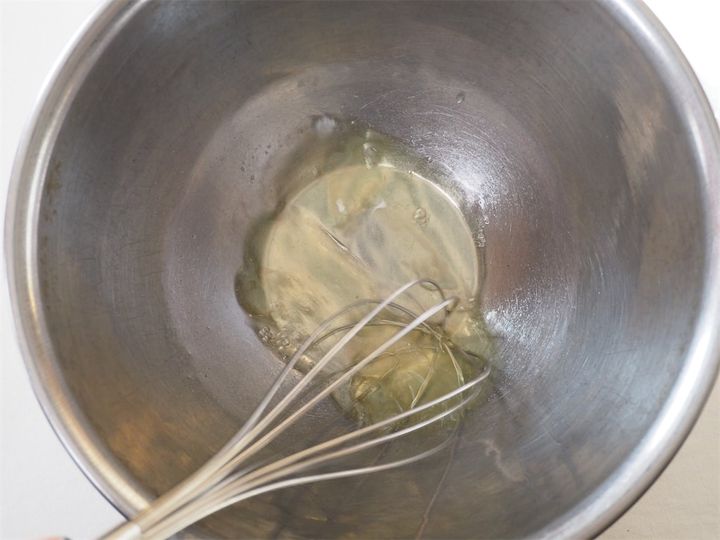 まずは、使う卵白の状態。卵が常温だとメレンゲが安定しないとのこと。冷蔵庫から出したてだとメレンゲが立ちにくいが、きめ細かく安定しやすいメレンゲに仕上がるのだとか。今回は、冷蔵庫から出したばかりの卵を使用します。詳しい説明はありませんでしたが、スフレオムレツには安定したメレンゲが必要なのでしょう。どちらかと言えば「立ちにくい」としている冷蔵庫から出したての卵を使ったとしても、簡単にメレンゲを立てられる方法だなんて、期待が膨らみますよね。