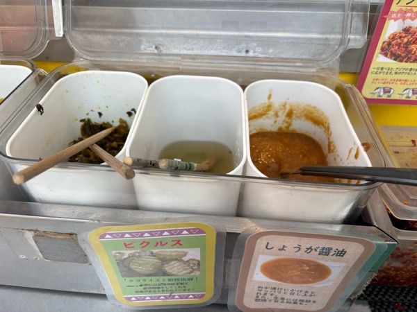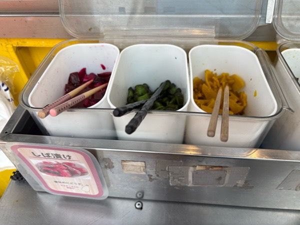 ピクルスやしば漬け、たくあんなど6種類の味変とチップスがありました。