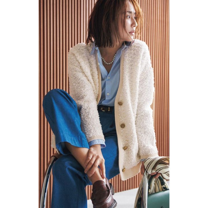 コーデの肝になるカーディガンは 表情のある素材でアップデート。 リッチな印象のトラッドスタイルに