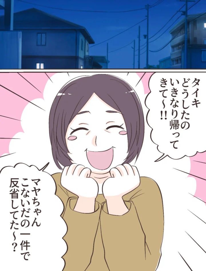 「タイキどうしたの。いきなり帰ってきて~!!マヤちゃんこないだの一件で反省してた~?」と笑顔でたずねる義母。