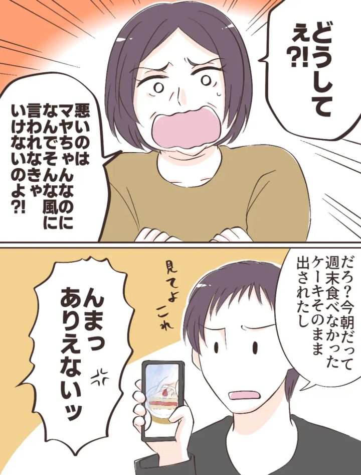 「どうしてぇ!?悪いのはマヤちゃんなのに、なんでそんな風に言われなきゃいけないのよ!?」と怒る義母に、「だろ?今朝だって、週末食べなかったケーキそのまま出されたし、見てよコレ」そう言って差し出されたケーキの写真を見せるタイキさんに、「んまっありえないッ!」と義母も一緒に怒りました。
