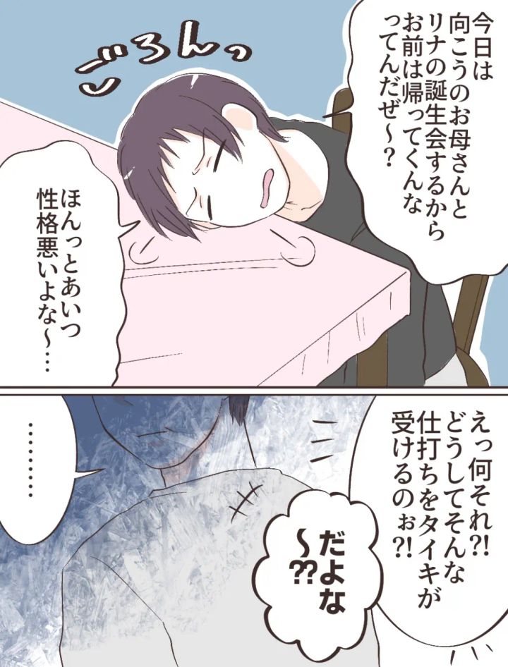 そして、「今日は向こうのお母さんとリナの誕生会するから、お前は帰ってくんなってんだぜ~?ほんとあいつ性格悪いよな~・・・」そう言ってうなだれるタイキさんに、「えっ何それ!?どうしてそんな仕打ちをタイキが受けるのぉ!?」と同調する義母に「だよな~??」と言って盛り上がる二人。