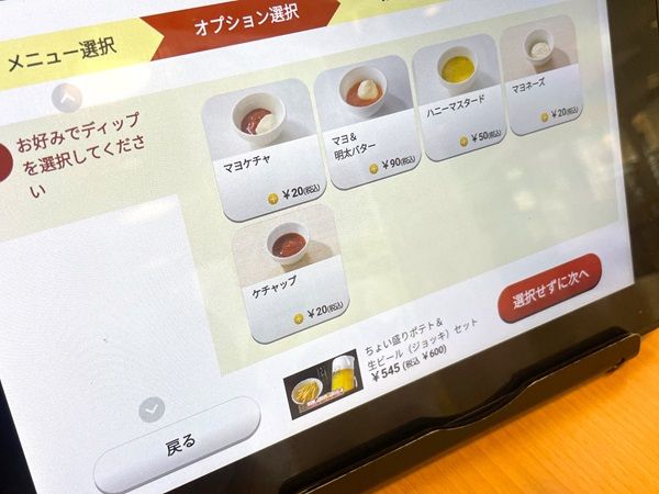 またポテトは+20円~90円でマヨネーズやケチャップ、マヨケチャ、ハニーマスタード、マヨ&明太バターなどのディップを追加することも可能です。味変するとさらにお酒が進みそう!