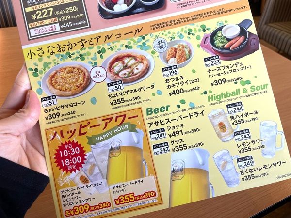 ちなみに平日10時30分から18時30分はハッピーアワーも開催! 通常390円の「アサヒスーパードライ(グラス)」、「角ハイボール」、「レモンサワー」、「甘くないレモンサワー」の4つが340円に、通常540円の「アサヒスーパードライ」はなんと150円も安い390円で楽しむことができるんです!