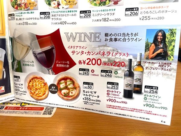 他にもワイン好きなら「グラスワイン(白)」、「グラスワイン(赤)」(ともに220円)でせんべろを楽しむのもおすすめ。おつまみには「ちょいピザマルゲリータ」(390円)や「炙り生ハムのカプレーゼ」(390円)、「チーズフォンデュ(ソーセージ&ブロッコリー)」(390円)あたりが合いそうです。