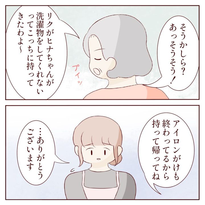 すると、「そうかしら?」と言った後で、「リクが、ヒナちゃんが洗濯物をしてくれないってこっちにもってきたわよ~。アイロンがけも終わってるから持って帰ってね」とヒナさんに言い、「・・ありがとうございます」ヒナさんは静かにそう答えました。