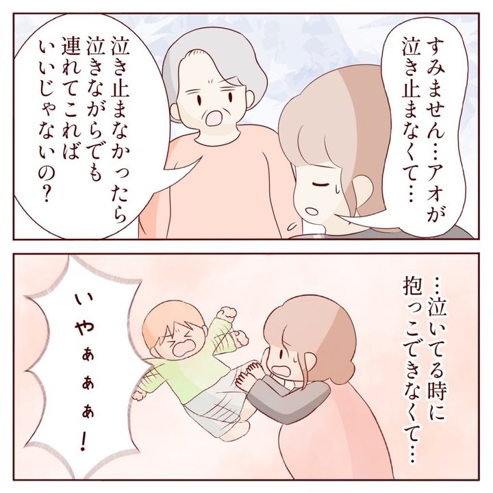 「すみません・・アオが泣きやまなくて・・」ヒナさんがそう言うと、「泣き止まなかったら、泣きながらでも連れてこればいいじゃないの?」と義祖母に言われて、「・・抱いてる時に抱っこできなくて・・」と言うと、