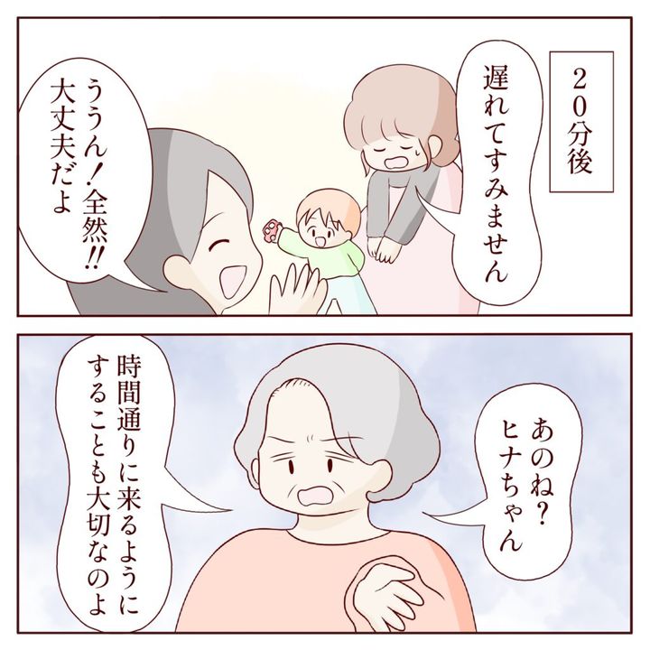 約束した時間から20分後に到着したヒナさんとアオくん。「遅れてすみません」と謝るヒナさんに、「ううん!全然!!大丈夫だよ」と答えるカナコさん。すると、「あのね?ヒナちゃん。時間通りに来るようにすることも大切なのよ」と義祖母が言いました。