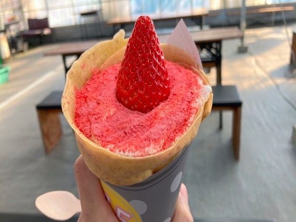 こちらのキッチンカーは、いちご農園にあり、農園で摘んだいちごをそのまま使うという、すごく魅力的なお店です。 クレープを作ってもらう前に農園の中に入って自分でいちごを摘んで、そのいちごでクレープを作ってもらえます。農園に入ると匂いだけで幸せな気分になれますし、摘むいちごは自分で選べるので、大きくて美味しそうなのをしっかり吟味できますよ♪