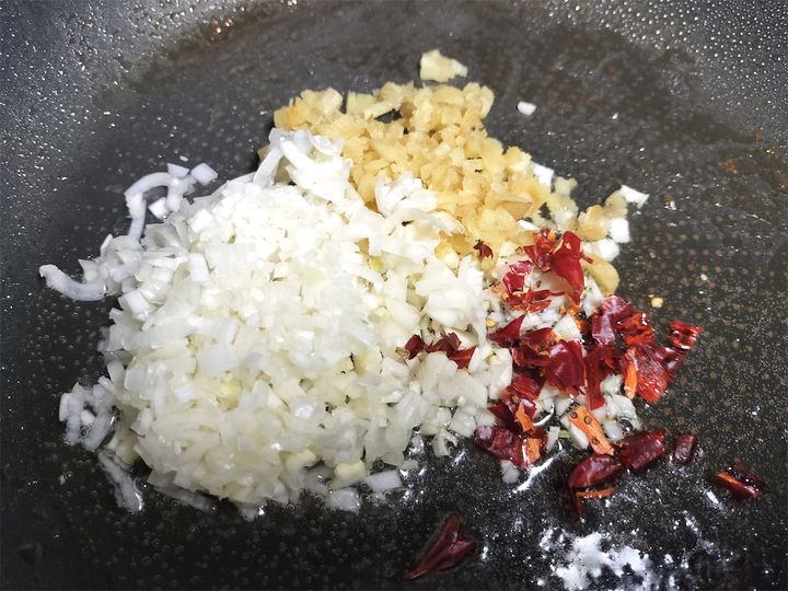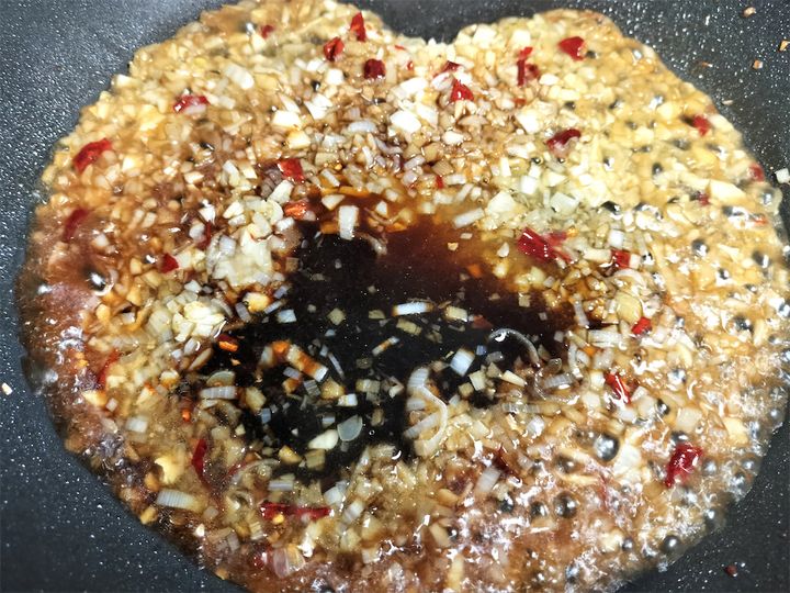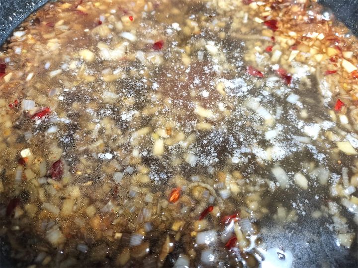 3. 油が残った鍋ににんにく、しょうが、長ねぎ、赤唐辛子を入れて炒めます。