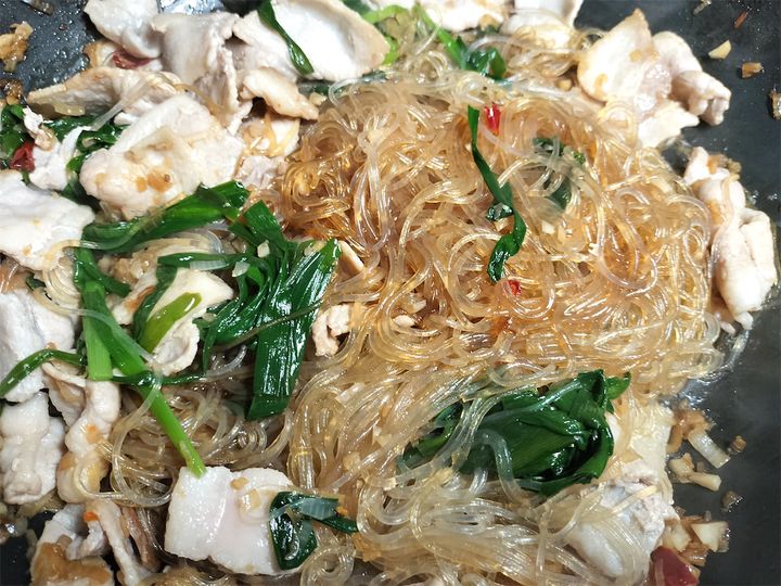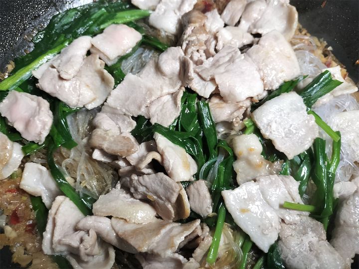7. 豚肉を戻し、春雨にスープを吸わせるように混ぜながら炒めます。