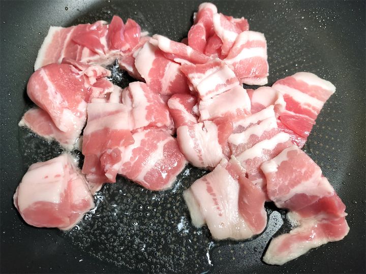 豚バラ薄切り肉は2cm幅に切り、ほぐしておきます。