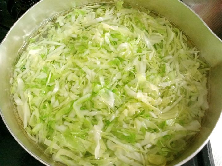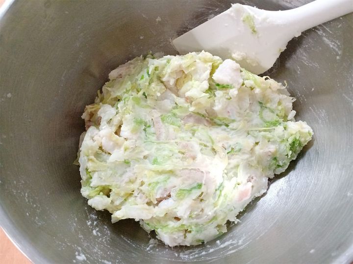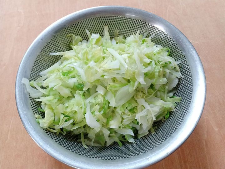2キャベツは千切り、エビとホタテは小さく切り、それぞれ下茹でする。エビは一尾だけ飾り付け用に切らずに取っておく。
