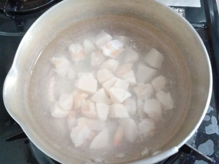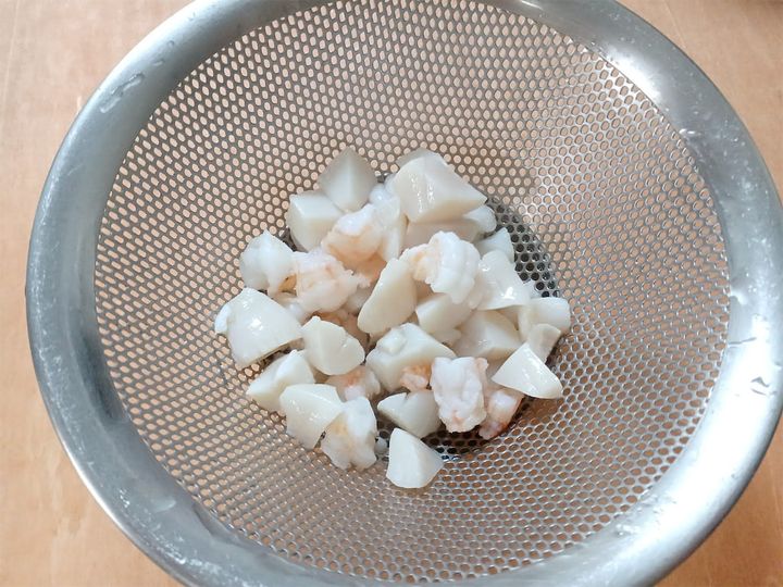 今回は剥きエビと生のホタテを使いましたが。それぞれひと口大に切り、火を通しておきます。