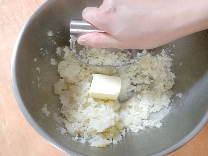 茹で上がったら熱い内にマッシャーなどで潰し、余熱でバターを溶かす。