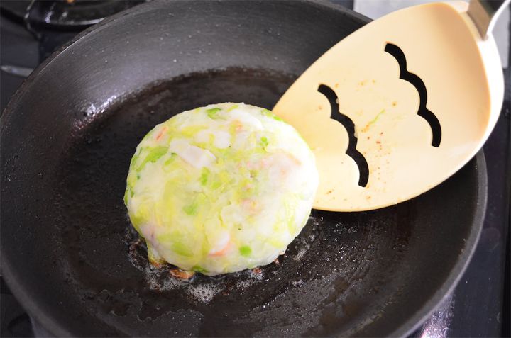ホロっと崩れやすいので、フライ返しなどでやさしく返します。