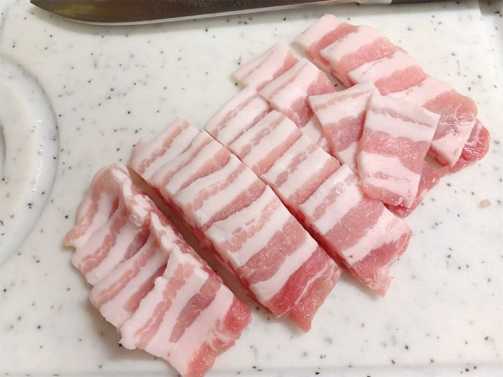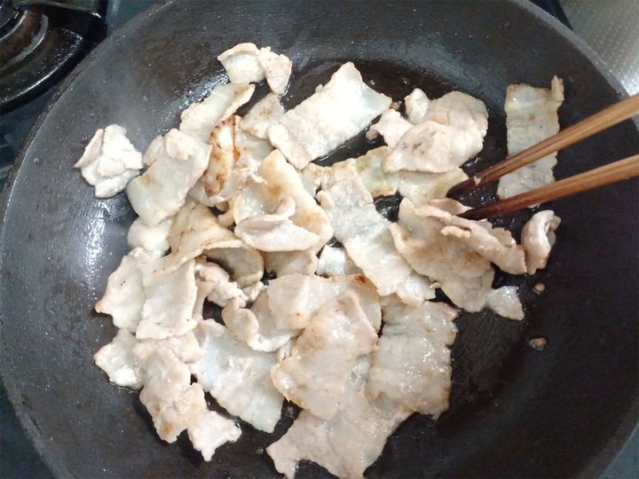 3.豚肉は2~3cmの短冊切りにし、フライパンで軽く火を通しておく。