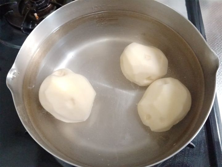 1.じゃがいもは皮を剥いて、適量の塩(分量外)を加えたひたひたの水(分量外)で茹でる。竹串が通るくらいまで柔らかくなったら、水気を切ってバターと一緒にボウルに入れ、熱いうちに潰す。