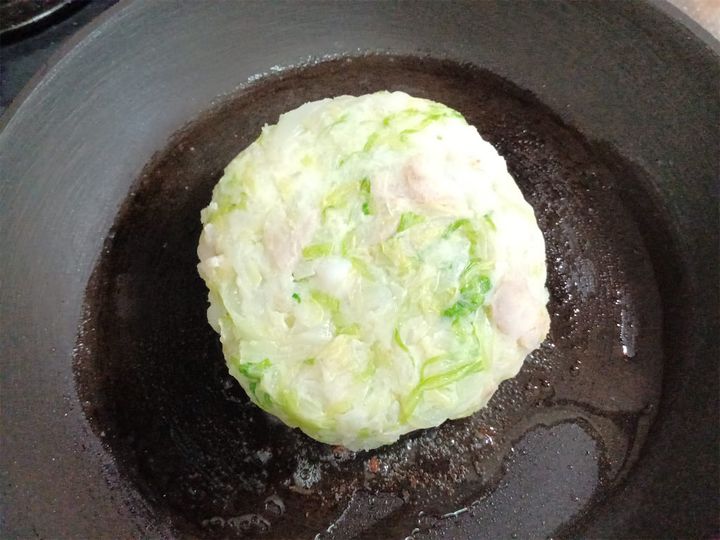 5.円形に整えたら、熱したフライパンで両面に焦げ目がつくまで焼く。