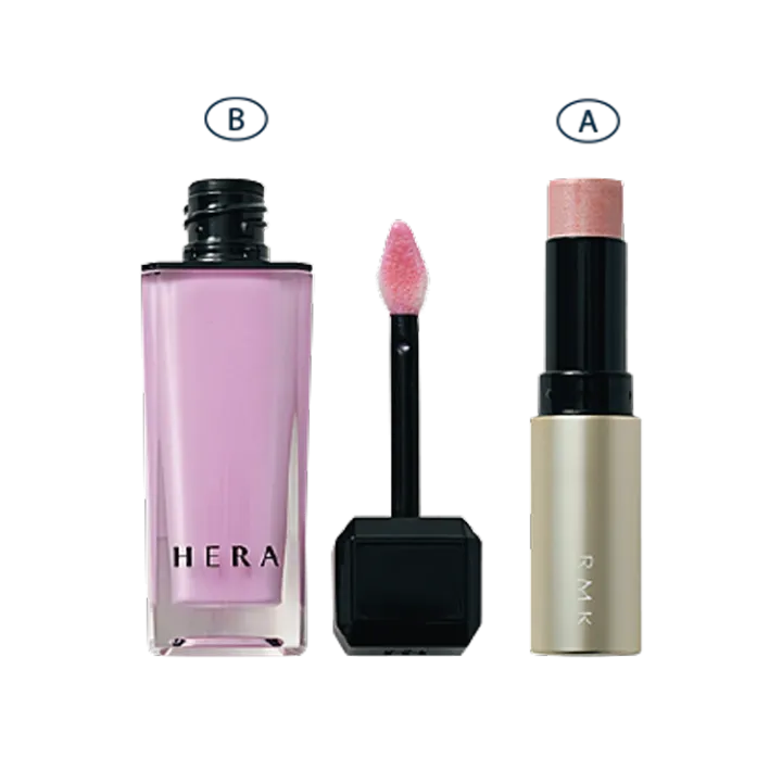 チークはをほおの中心に指で丸く広げて、ほどよい可愛らしさのある淡い血色ときらめくツヤをお肌にトッピング。