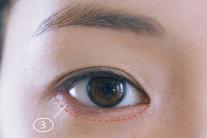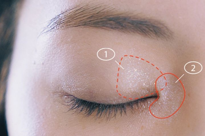 上まぶたの中央から目頭にかけてを塗る。目頭のくぼみ部分には広めにを塗る。