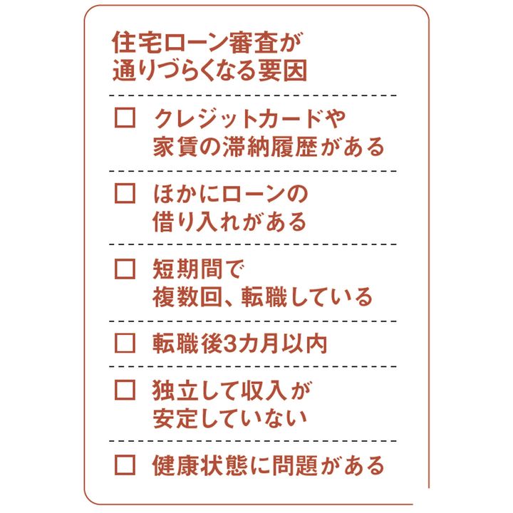 20~30代が注意したいのが転職や独立。同業種で年収アップの転職なら、3カ月経てば問題ないことが多いですが、3年以内に3回以上転職していると、審査が通らない銀行も出てきます。また、独立して個人事業主になるとローンが組みづらくなります。3年間の売上実績があればローンを組めますが、会社員なら自己資金ゼロで借りられるところ、2割程度の自己資金が必要に。また、体の病気や精神疾患はローンを借りる際に入る団体信用生命保険の条件でNGとなる可能性があります。