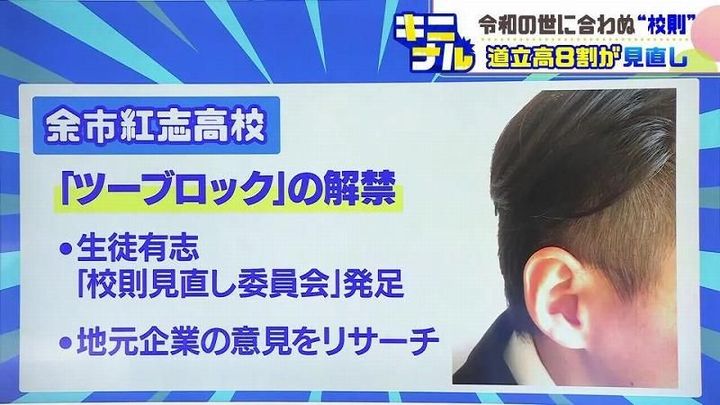 これまで「高校生らしい髪型ではない」とされていたところを、生徒や教員がインターン授業などで地元企業を訪れた時にアンケートを行い、「さわやかなイメージがある」「過度な刈り上げでなければいい」など肯定的な意見もあることを調査。