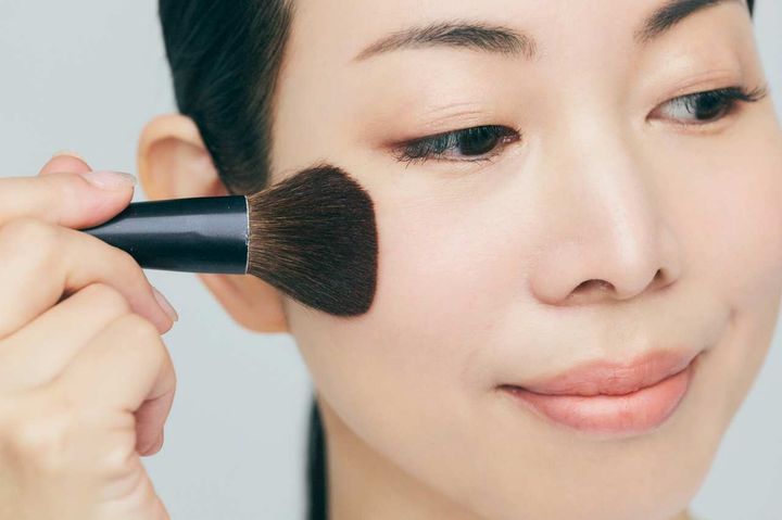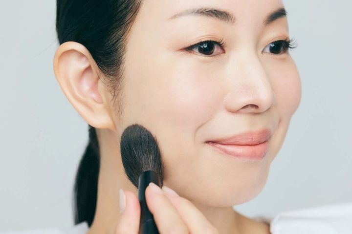 ①明るめのチーク(使用アイテムE)を広めにふんわりとのせます。