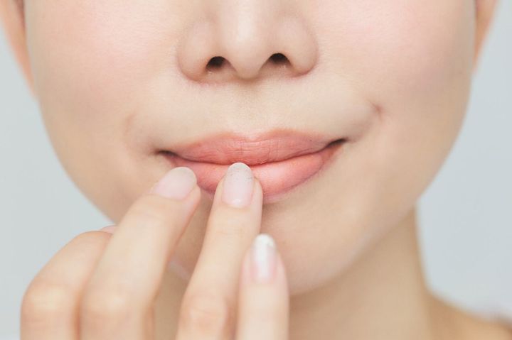 ①唇の色味を整えるためにマットリップ(使用アイテムG)を塗ります。