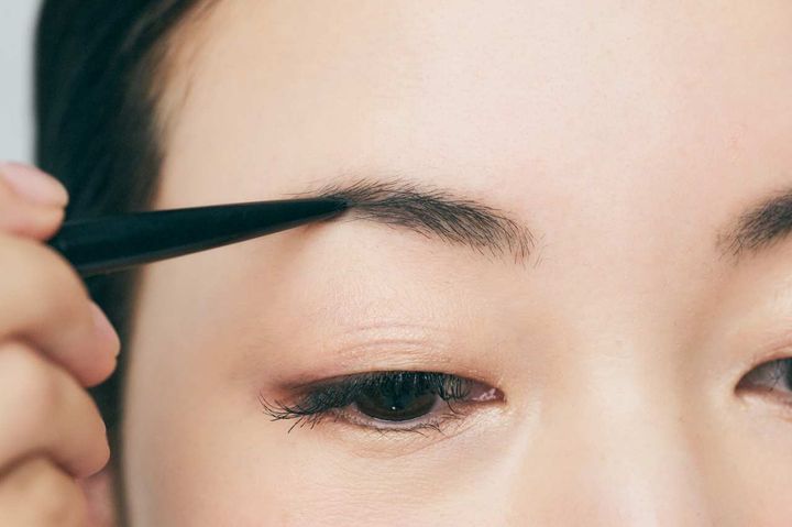 ①卒入式では写真を撮ることが多いので、眉はしっかりめに描きます。全体的に黒で描くと強くなりすきてしまうので、眉マスカラの後にグレーのペンシル(使用アイテムJ)ですき間を埋めて。