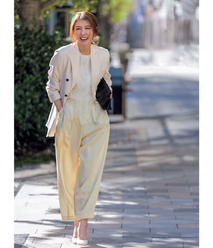 パンツ¥28,600トップス¥26,400(ともにランバン オン ブルー)ジャケット¥107,800(ハイク/ボウルズ)バッグ¥75,900(マエストソ/アマン)靴69,300(ペリーコ/アマン)ピアス¥62,700(ヌゥ ユゥ/アイネックス)リング¥46,200(ブランイリス/ブランイリス トーキョー)