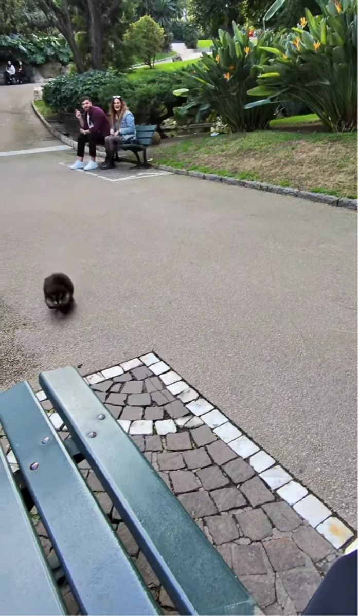 奥のベンチに座っている男女のもとから、子犬が元気いっぱいに駆け戻ってきます。 実はこの子、飼い主さんの元を離れて出会ったばかりの人たちのところへ遊びに行っていたのです。